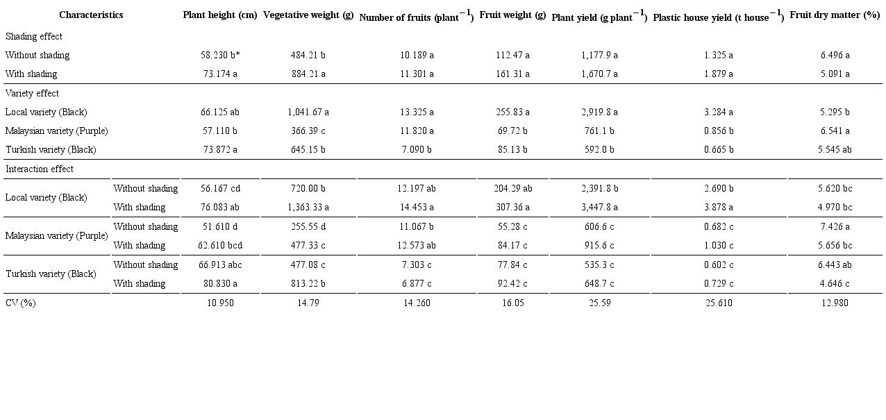 The shading treatment for the Turkish variety resulted in a significant increase for plant height (80.830 cm), when compared to the other interaction treatments (Table 3), whereas the shading treatment for the local variety showed the highest values for vegetative weight (1,363.33 g plant−1), number of fruits per plant (14.453), fruit weight (307.36 g), plant yield (3,447.8 g plant−1) and total yield per plastic house (3.878 t plastic house−1), when compared to the other treatments, while the Turkish variety without shading had the lowest total yield per plastic house (0.602 t plastic house−1). This shows the positive effect of shading in improving the eggplant growth and yield by reducing the negative effects of high heat and solar radiation, thus reducing the evaporation rate and the moisture loss for both plants and fruits, and this is confirmed by the results of the Table 3, with the low percentage of dry matter under shading, when compared to the control treatment.