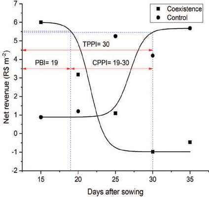 The net revenue means were subjected to non-linear regression by the Boltzmann’s sigmoidal model ( Pitelli et al. 2013). Subsequently, the period before interference, total prevention period against interference and the critical prevention period against interference were determined considering 5 % of losses in production and revenue.