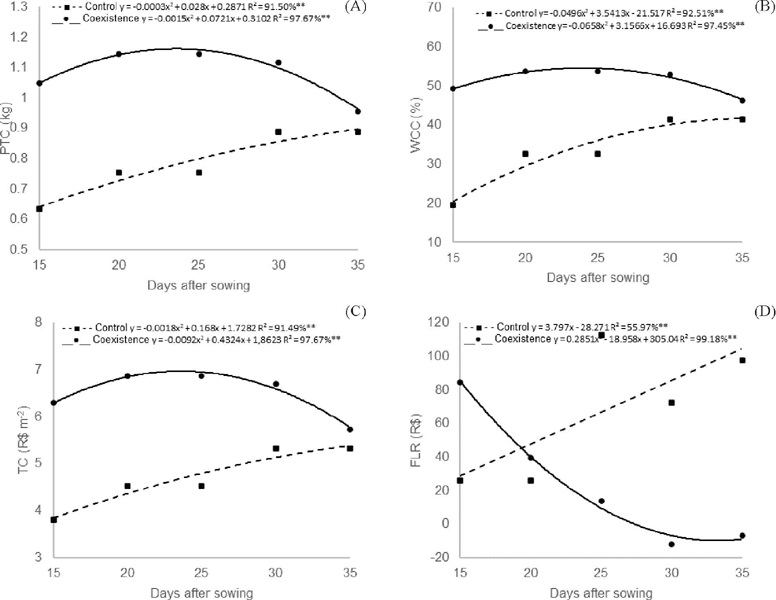 The total revenue increased linearly by R$ 0.33 m −2 for each weed control day. In contrast, in the coexistence treatment, there was a linear decrease of R$ −0.37 m −2 ( Figure 2A). The same occurred with the profitability margin, which increased by 2.29 % in the control treatment and decreased by −3.50 % in the coexistence treatment for each day of cultivation ( Figure 2C).