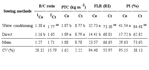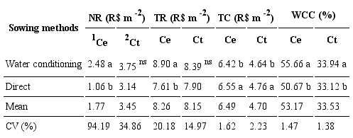 Costs with weed control were the same for both types of sowing. However, since the weed control cost variable refers to the percentage of this control among total costs, this variable showed higher values in the water conditioning treatment, since the total costs were inferior to those of direct sowing, resulting in a higher weed control cost percentage.