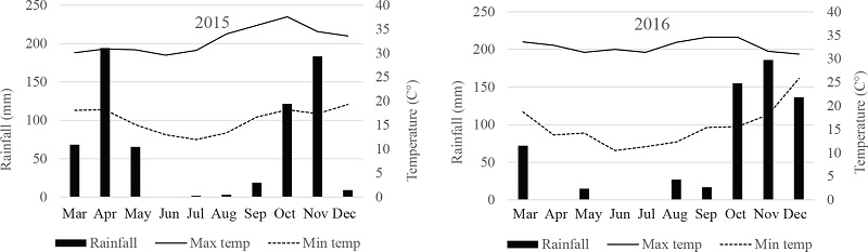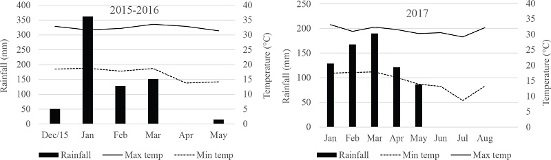 The contents of nitrogen, phosphorus, potassium, calcium, magnesium and sulfur in the dry matter were analyzed according to Malavolta et al. (1997). In the intercroppings, the species were sampled, processed and analyzed together. The nutrient content (kg ha-1) was determined based on the dry matter and shoot yield. The cotton (FM975WS cultivar) was sown on December 17, 2015 and January 05, 2017. The row spacing was 0.76 m, with a population of 105,264 plants ha-1. During the cultivation of the cover plants (Figure 1) and cotton (Figure 2), data on rainfall and monthly maximum and minimum temperatures were recorded each year.