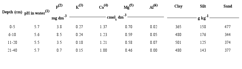 The study was conducted in the 2015-2016 (year one) and 2016-2017 (year two) crop seasons, in Santo Antônio de Goiás, Goiás state, Brazil (16º29’37.2”S; 49º17’56.9”W), in a Typic Acrustox (clay, kaolinitic, thermic Typic Acrustox) soil or red Latosol (Oxisol) with clayey texture (Santos et al. 2018). The experimental area was previously cultivated with soybean, pasture and millet in a no-tillage system. At the beginning of the study, the soil presented the chemical characteristics described in Table 1, with granulometry corresponding to 463, 143 and 394 g kg-1 of clay, silt and sand, respectively.