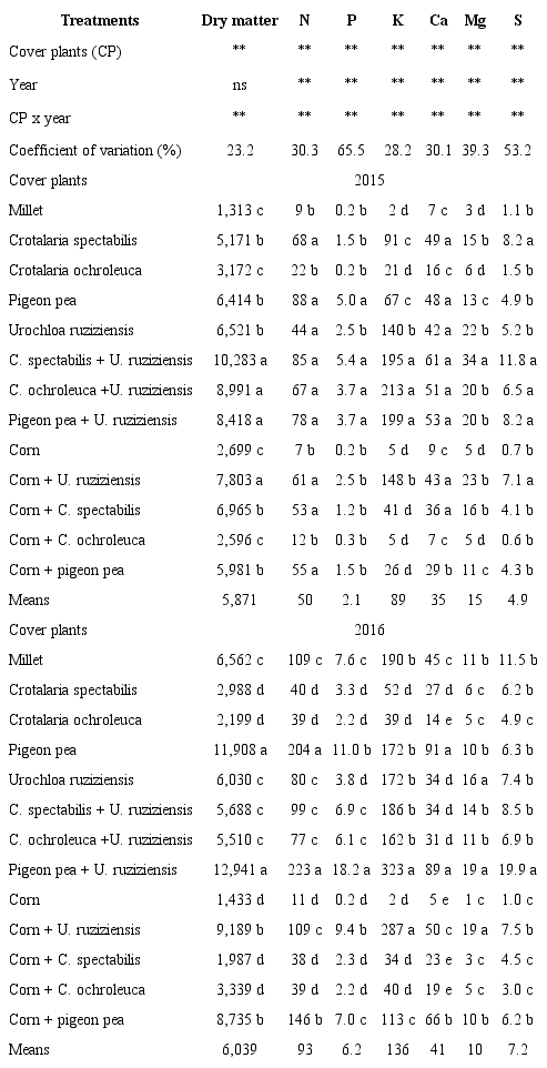 The single cultivation of U. ruziziensis in 2015 produced 6,521 kg ha-1 of dry matter, lower than that observed in all intercroppings of this Poaceae. The P, K and S contents in the dry matter of U. ruziziensis intercropped with leguminous plants was higher than for the single U. ruziziensis (Table 2). According to Silva et al. (2021), the use of a mix of cover plants, especially with species that have contrasting characteristics, has been growing, because they can provide more benefits to the system than the cultivation of single species, such as a greater availability of nutrients for crops and improved soil protection.