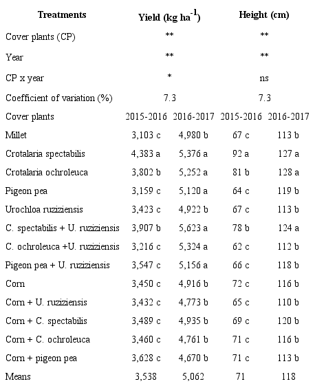 The effects of cover plants and year were significant for all characteristics, except for the year on dry matter yield (Tables 2 and 3). The interaction between cover plants and years was significant, except for plant height (Table 2). The interaction between cover plants and years was not significant only for plant height (Table 3). For intercropping, with the presence of U. ruziziensis, the highest means for dry matter were obtained in 2015 (Table 2). In 2016, the significantly greatest amount of dry matter was produced by pigeon pea and pigeon pea + U. ruziziensis, with 11,908 and 12,941 kg ha-1, respectively. The better performance of pigeon pea for biomass production in 2016 can be explained by drought tolerance due to vigorous root growth (Pípolo & Pípolo 1994).