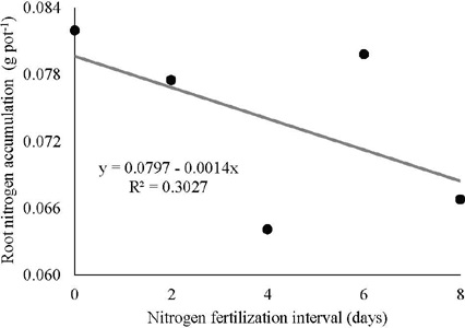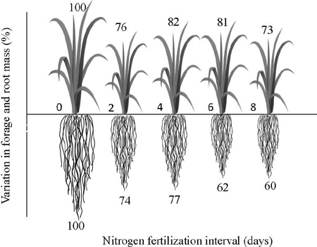 Carbohydrate variations in grass forages typically occur in roots after defoliation (Alderman et al. 2011), particularly under conditions of high grazing intensity (Silva et al. 2015) or shading (Coura et al. 2020). Plants with greater nutrient reserves may exhibit increased tolerance to a longer delay in nitrogen replacement in the soil, initiating the regrowth process. Therefore, it is crucial to determine the optimal number of days between grass harvest and fertilization that yields the most favorable response, in terms of grass regrowth and accumulation of carbohydrates and nitrogen in the roots.