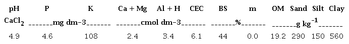 The soil used in the experiment was an Oxisol (Santos et al. 2018), equivalent to Ferralsols (FAO 1998), collected from the 0-20 cm depth layer and characterized by its clayey composition. The soil chemical and grain size analyses (Table 1) were performed according to Teixeira et al. (2017). The soil was sieved through a 4-mm sieve and then transferred to 5.5-dm³ pots. The soil’s base saturation was adjusted to 60 % using dolomitic limestone (PRNT = 86 %; Vilela et al. 2007). Irrigation was conducted daily using the gravimetric method (Cabral et al. 2018), to ensure that the applied water mass elevated the soil moisture to its maximum water retention capacity.