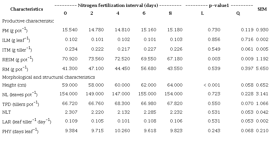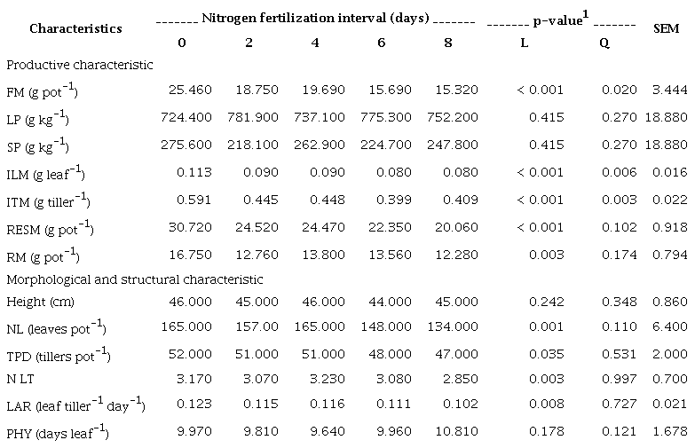 The development of the BRS Piatã was affected by the increased interval between harvest and nitrogen fertilization. Linear decreases of 34.70 and 26.68 % were observed for residual and root mass, respectively (Table 2). This reduction can be attributed to the nutritional stress experienced by BRS Piatã, due to delayed nitrogen fertilization. When nitrogen is not promptly supplied, the grass uses its reserves in the roots to minimize the damage to shoot productivity. The use of nitrogen reserves stored in the stem base and roots under stressful conditions has been reported in the literature (Volenec et al. 1996, Silva et al. 2014).