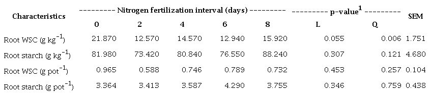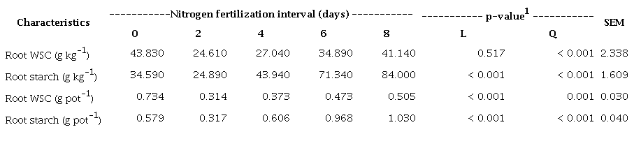 A linear increase in the height of the BRS Quênia was observed when fertilization was delayed by 8 days, if compared to the fertilization applied on the day of the harvest (Table 4). The content of WSC in the roots (g kg-1) exhibited a quadratic effect in response to the fertilization time (Table 5). The average WSC content per pot was 0.764 g, while the accumulation of starch in the roots were 80.81 g kg-1 and 3.682 g pot-1. The nitrogen content in the roots (p > 0.05; SEM = 1.0037) was not significantly affected by the fertilization time. BRS Quênia showed no significant response to the interval between harvest and fertilization, except for the WSC content, with no changes observed in the content and accumulation of starch in the roots.