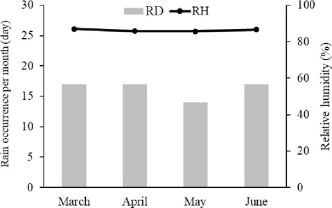 The research was carried out at an outdoor agricultural facility in Jakabaring (104º46'44''E; 3º01'35'S), Palembang, South Sumatra, Indonesia, under urban tropical climate. Two-node stem cuttings were planted on March 12, 2022, at the near end of the rainy season in the country. The Brazilian spinach did not produce viable seeds due to infertility, and data were collected on May 21, 2022, or 10 weeks after planting (WAP). The number of rainy days per month during the transitional period from rainy to dry season was still relatively high, at around 15 days. The air humidity was consistently above 80%, contributing to the warmer tropical climate and the large acreage of wetlands surrounding the research location (Figure 1).