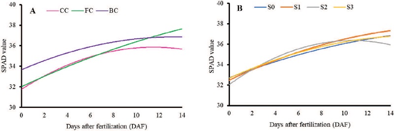 Excessive water conditions in the substrate also reduce the chlorophyll content (Zhang et al. 2019a), as confirmed by Brazel et al. (2021) in leafy vegetables such as kale (Brassica oleracea). However, the decrease in the SPAD value under excessive water conditions was caused by the lack of oxygen (anoxia) in the growing medium, because the air that the soil pores should contain was replaced by water excess.