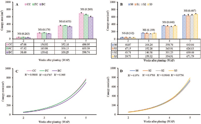For the treatments, the Brazilian spinach exhibited a consistent growth improvement along with the increasing plant age, without differing among them. The phenomenon was indicated by the canopy area in each treatment, and the growth mathematically followed an exponential curve (Figure 3).