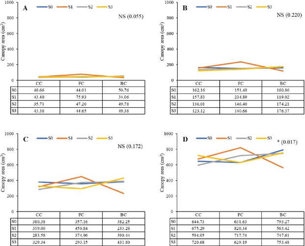 The canopy area continued to increase at similar rates for the growing systems and substrate mixtures. The interactions of the cultivation system and substrate mixtures were only observed in the canopy area after the Brazilian spinach reached 5 WAP. A significant interaction effect at 5 WAP was observed between the bottom-wet culture system and substrate mixture with 25 % of fine sand (Figure 4).