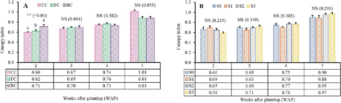 The canopy densities were not affected by both treatments, namely cultivation systems and substrate compositions, but continuously increased as the plants grew. There was also an increase in the growth of individual leaf in each treatment, triggering an increase in canopy density at 5 WAP (Figure 5).
