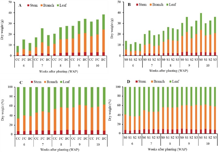 The specific shoot growth of the Brazilian spinach could be proxied by its dry weight and partitioned into leaves, branches and main stem (Figure 6). At the later growth stage (6 to 10 WAP), there was a change in the ratio between leaf weight and the weight of the other parts of the shoot, with the leaf being dominant during the early growth stage, specifically at 6-7 WAP.