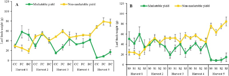 The harvested Brazilian spinach leaves were already at their maximum size, but remained young and healthy. Commercially, these leaves were harvested periodically based on their readiness. As presented in Figure 7, the Brazilian spinach produced optimal and relatively stable results from 6 to 9 WAP. The Brazilian spinach cultivated under water-sufficiency conditions, namely floating and bottom-wet culture systems, provided better leaf yields, when compared to the conventional cultivation with water supplies that depended only on rain. Meanwhile, the application of rice husk biochar and fine sand as ameliorants or in combination had no significant impact on the leaf yields.