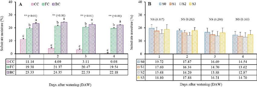 The substrate water availability was closely related to its water content. The floating and bottom-wet culture were more stable due to the consistent water supply driven by capillary force, vertically transporting water from the bottom to the upper surface of the growing substrate. The water supply in the conventional cultivation system depended only on rainfall. Meanwhile, in the substrate mixture treatment, there was no significant difference for water availability (Figure 8). The limited water source in the conventional cultivation system directly decreased the water availability in the substrate, needing watering on every non-rainfall day.