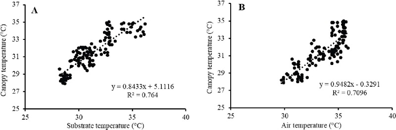 The physiological condition of the Brazilian spinach was associated with the canopy temperature, which was directly or indirectly affected by microenvironment conditions such as air temperature (direct) and substrate temperature (indirect). However, these effects were confounded with the water status of each organ (Figure 9).