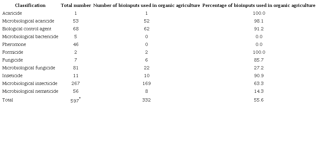 Of the 597 bioinputs included in the National Catalog of Bioinputs and found in the application, 332 have been released for use in organic production systems (information found in the application, whose bioinputs that can be used in organic agriculture present, in particular, the following expression: “phytosanitary product with approved use for organic agriculture”), which represent 55.6 % of the total. Among the bioinput classes, the one that represents the highest percentage is the microbiological insecticide, with 267 products constituting 44 % of the total bioinputs inserted in the application.