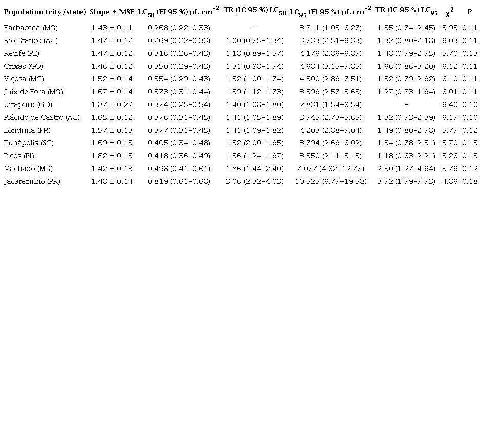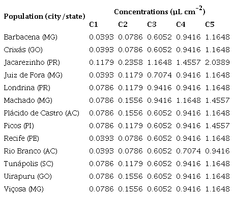 The following concentrations were used for definitive deltamethrin toxicity bioassays: 0.0027, 0.0046, 0.0093, 0.0173 and 0.0519 L cm-2, except for the Crixás population, whose values were different (0.0027, 0.0046, 0.0056, 0.0093 and 0.0173 L cm-2). Increasing levels of EOPA were used for the toxicity assay, as indicated in early testing (Table 1).