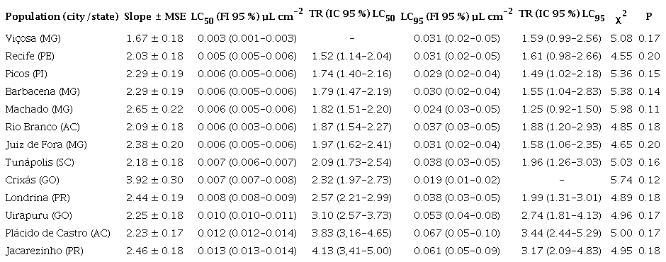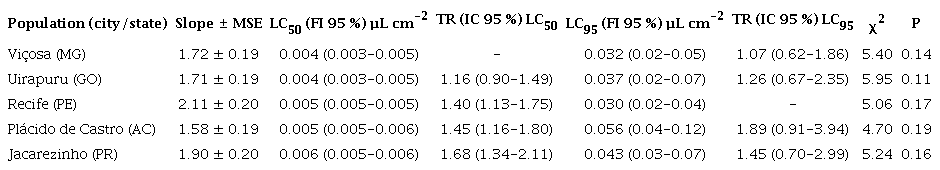 The toxicity of the binary mixture of EOPA + deltamethrin varied from 0.003 to 0.272 µL cm-2, with LC50 and LC95 ratios ranging from 1.0 to 1.68 times. There were no significant differences in the curve slope of the five analyzed populations (1.58-2.71), reaffirming the toxicological homogeneity. The populations from Jacarezinho had a greater LC50, whereas the Plácido de Castro population had a higher LC95 (Table 4).