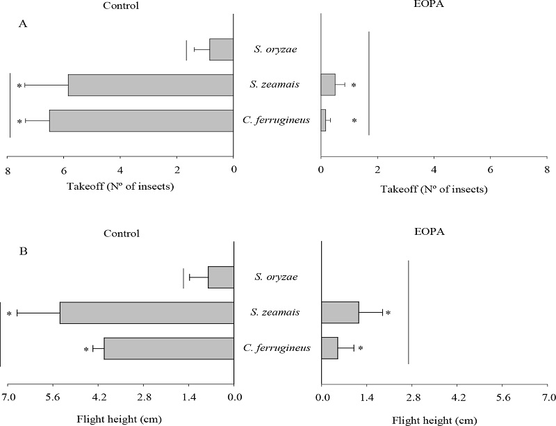 With regard to the flight bioassay, the number of insects that took off varied significantly among species (F2;30 = 9.15; p = 0.0008) and between treatments (EOPA and control) (F1;30 = 44.43; p < 0.0001), and there was an interaction between these two factors (F2;30 = 7.32; p = 0.0026). The number of insects that took off, with regard to flight height, was significantly lower in the flight chambers treated with LC5 of EOPA (Figure 1), with this sublethal concentration completely inhibiting the flight activity of S. oryzae.