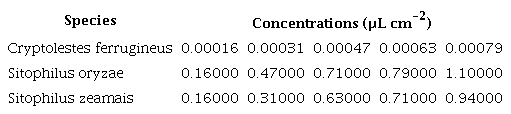 Individuals of S. zeamais, S. oryzae and C. ferrugineus aged 1 to 15 days were used in the toxicity assays. Preliminary experiments were conducted to estimate the concentration with the highest and lowest mortality after 24 h of exposure and to determine the mortality after 48 h of exposure, within a 5 to 95 % interval. These data were used to establish five concentrations for insect exposure in the definitive bioassays for the three species (Table 1).
