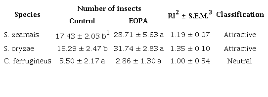 With regard to attractiveness, the number of insects varied significantly between the arenas treated with EOPA and with the control (F2;36 = 28.18; p < 0.0001). There were more individuals of S. zeamais and S. oryzae in the arenas treated with EOPA, in relation to the control, although no significant variation was observed for C. ferrugineus (Table 3). The EOPA was classified as attractive for the two Sitophilus species and as neutral for C. ferrugineus, according to the methods established by Mazzoneto & Vendramim (2003).
