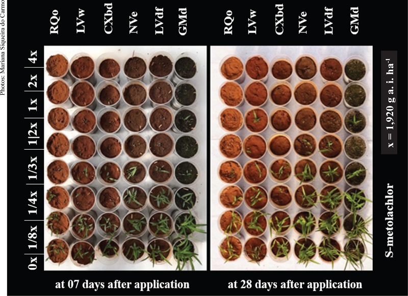 The S-metolachlor herbicide was administered at eight different doses [0, 1/8x, 1/4x, 1/3x, 1/2x, 1x, 2x and 4x], in relation to the maximum recommended dose, with x representing 1,920 g ha-1 of active ingredient.