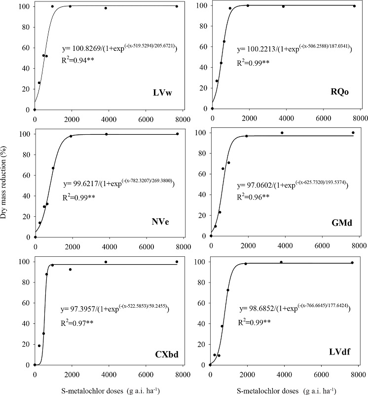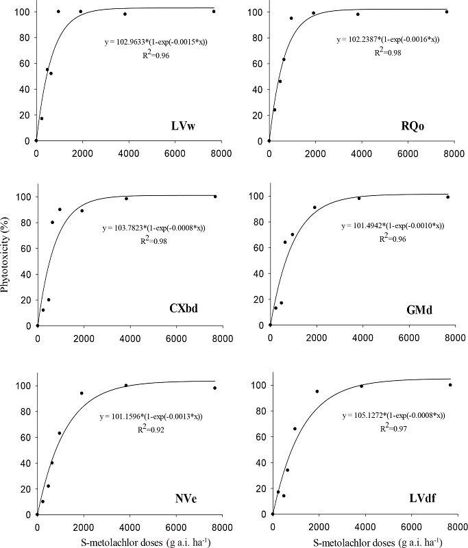 The data obtained from the dose-response study were subjected to analysis of variance through the F test, and if the F test was found to be significant, the Tukey test (p = 0.05) was used to compare qualitative treatments, namely soil types or herbicide doses. Non-linear regression models were subsequently fitted according to the equations: y1 = a * [1 - exp(-b * x)] and y2 = a/{1 + exp[-(x - x0)/b]}, where y1 represents the phytotoxicity (%), while y2 indicates the dry mass reduction (%), x denotes the herbicide dose in g a.i. ha-1, and a, b and x0 are coefficients governing the curve. Specifically, a corresponds to the lower limit of the curve, while b delineates the difference between the maximum and minimum points of the curve.