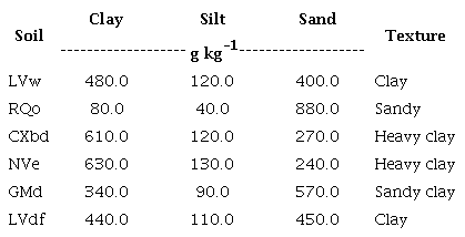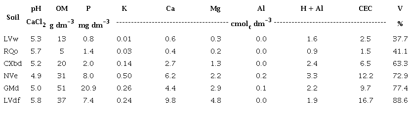 A completely randomized design was employed, in a 6 x 8 factorial arrangement, with five replications, resulting in a total of 240 experimental units. The factors under consideration were six soil types, classified according to Santos et al. (2018) and USDA (2014), respectively, as it follows: Gleissolo Melânico Distrófico - GMd (Typic Humaquept); Nitossolo Vermelho Eutrófico - NVe (Rhodic Eutrustox); Cambissolo Háplico Tb Distrófico - CXbd (Typic Dystrustepts); Latossolo Vermelho Ácrico - LVw (Rhodic Acrustox); Latossolo Vermelho Distróférrico - LVdf (Rhodic Haplustox); and Neossolo Quartzarênico órtico - RQo (Typic Quartzpsamment).