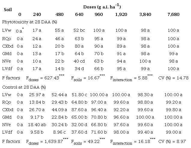 Significant differences in the percentage of phytointoxication (PT%) among the soils were only observed at the doses of 480, 640 and 960 g ha-1. At the 480 g ha-1 dose, the Rhodic Acrustox (LVw) and Typic Quartzpsamment (RQo) soils exhibited a higher PT% in Brachiaria decumbens plants, when compared to the other soils. Similarly, at the 960 g ha-1 dose, in addition to the Rhodic Acrustox (LVw) and Typic Quartzpsamment (RQo), Typic Dystrustepts (CXbd) also displayed a higher PT% in Brachiaria decumbens plants than Rhodic Haplustox (LVdf), Rhodic Eutrustox (NVe) and Typic Humaquept (GMd) (Table 3).