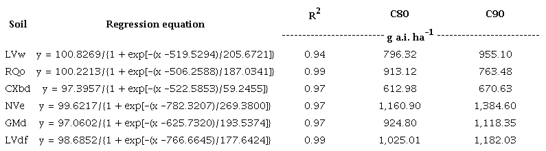 The percentage of dry matter reduction (DMR%) disparities among the soils persisted up to the 960 g ha-1 dose. Beyond this threshold, the soils exhibited no significant differences from one another. At the lowest applied dose (240 g ha-1), LVw and CXbd recorded a higher DMR% than the other soils, with LVdf showing the lowest DMR%. When half the recommended dose (960 g ha-1) was administered, LVw, CXbd and RQo had already achieved over 90 % control, distinguishing them from GMd, NVe and LVdf, which recorded control rates exceeding 60 % at this dose (Table 3).