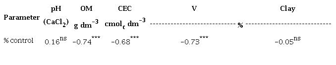 The DMR80 and DMR90 doses were estimated from the non-linear regression model and are presented in Table 4. These doses fall below the maximum recommended on the product label (1,920 g a.i. ha-1). Table 5 presents the correlation analyses results between the percentage of dry matter reduction (DMR%) and soil parameters. These analyses revealed a strong negative correlation (-0.74) between the organic matter content and base saturation with DMR%, implying that higher values of these parameters correspond to a reduced Brachiaria control. The cation exchange capacity demonstrated a moderate (-0.68) correlation with the DMR%. Notably, there was no significant correlation between the clay content and DMR% (-0.05ns).