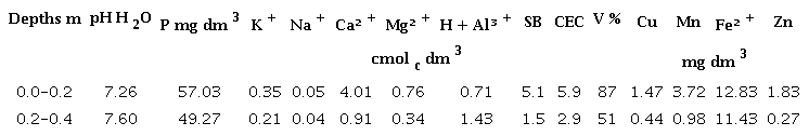 For the initial characterization of the area, samples of soil, leaves and fruits in the marble ball or “ chumbinho” stage of mango cv. Kent were collected and analyzed for fertility and plant nutritional status as Ca and nitrogen concentration (g kg −1 of dry matter), total soluble carbohydrates and amino acids (µmol g −1 of fresh matter). Table 1 contains the results of the soil analysis at the initial stage of fruit development (“ chumbinho”).