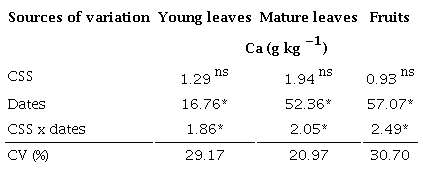 The Ca concentration in the fruits ( Figure 3C) also presented oscillations in the average values within the evaluation dates and were much lower than those observed in mature and young leaves ( Figures 3A and 3B). When comparing all the evaluation dates, it was noticed that there was an almost generalized decrease in the Ca concentration among the supplementation strategies, including the control group, and that new signifcant increases were registered only in the sixth evaluation date.