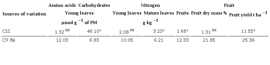 Among the variables analyzed at harvest, carbohydrates, total N in mature leaves and fruits, and yield difered among the supplementation strategies ( Table 3).