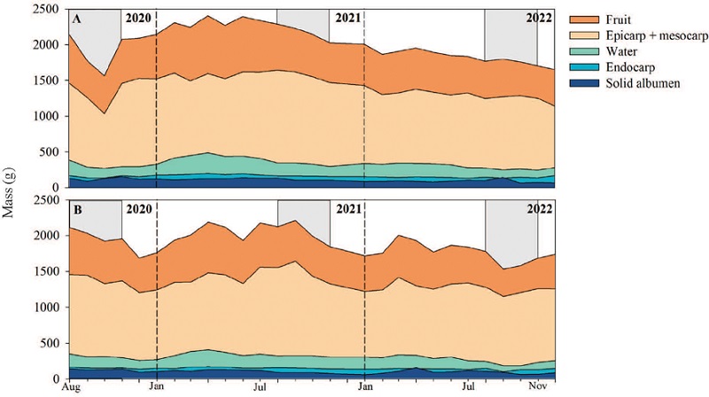 The yield and fruit composition components show an evident pattern of seasonal variation in their biomass, with a tendency toward a decrease in the less rainy period and an increase in the rainy period for both treatments ( Figure 6). It is observed that the year 2021 was the most productive one, with fruits reaching the maximum total biomass of 2,221.6 g in September and of liquid albumen of 407.9 g in April, for the irrigated area. In the non-irrigated area, the year 2021 also stands out, with maximum fruit mass of 2,406.5 g and liquid albumen of 486.9 g, both in April.
