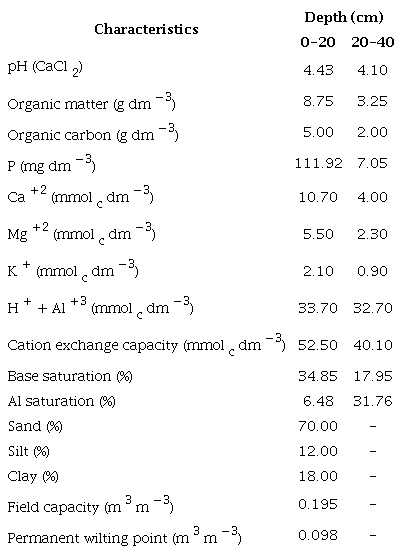 The soil in the area is classifed as a sandy loam Neossolo Quartzarênico ( Embrapa 2018), equivalent to Quartzipsamment ( USDA 2014), and its characteristics can be viewed in Table 1.