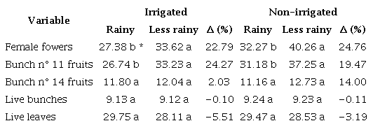 With regard to seasonality, the decreases of 22.79 % in the number of female fowers and 24.27 % in the number of fruits in the bunch n° 11 in the irrigated area, and of 24.76 and 19.47 in the non-irrigated area ( Table 2), for the same variables in the rainy season, may be related to the higher atmospheric humidity present during this period due to the higher rainfall ( Figure 2), an efect also verifed by Miranda et al. (2008).