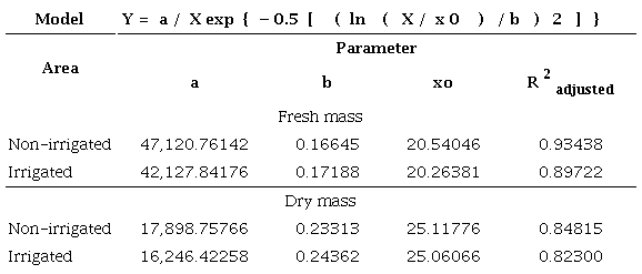 The fruit volume and biomass data and the fts applied to these variables can be seen in Figures 4 and 5. The fruit volume showed the same behavior in both areas, with progressive growth from the bunch n° 10 to the stages between the bunches n° 22 and 24, when the variable stabilized ( Table 3). Fruits belonging to the bunch n° 20 reached an average volume of 1,978.22 ± 504 cm³ for the non-irrigated planting and 1,827.01 ± 465 cm³ for the irrigated planting, and the diference between the areas possibly occurs because the plants in the areas have a diference of two years of age. The same biometric behavior of dwarf coconut fruits has been reported by Maciel et al. (2009) and Prado et al. (2013), considering the longitudinal and transverse diameters.
