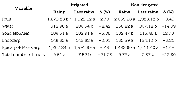 In general, the total fruit mass was around 3.45 % higher in the rainy season, when compared to the less rainy season, with values of 2,059.28 and 1,988.18 g, respectively, when cultivation was carried out in the non-irrigated area under standard farm management ( Table 5). In the irrigated area, on the other hand, there was an increase of 2.73 % in the average fruit mass, showing that irrigation is a technique that allows a greater stability in production throughout the year, avoiding a decrease in average biomass, with this increase being directed toward the epicarp + mesocarp mass.