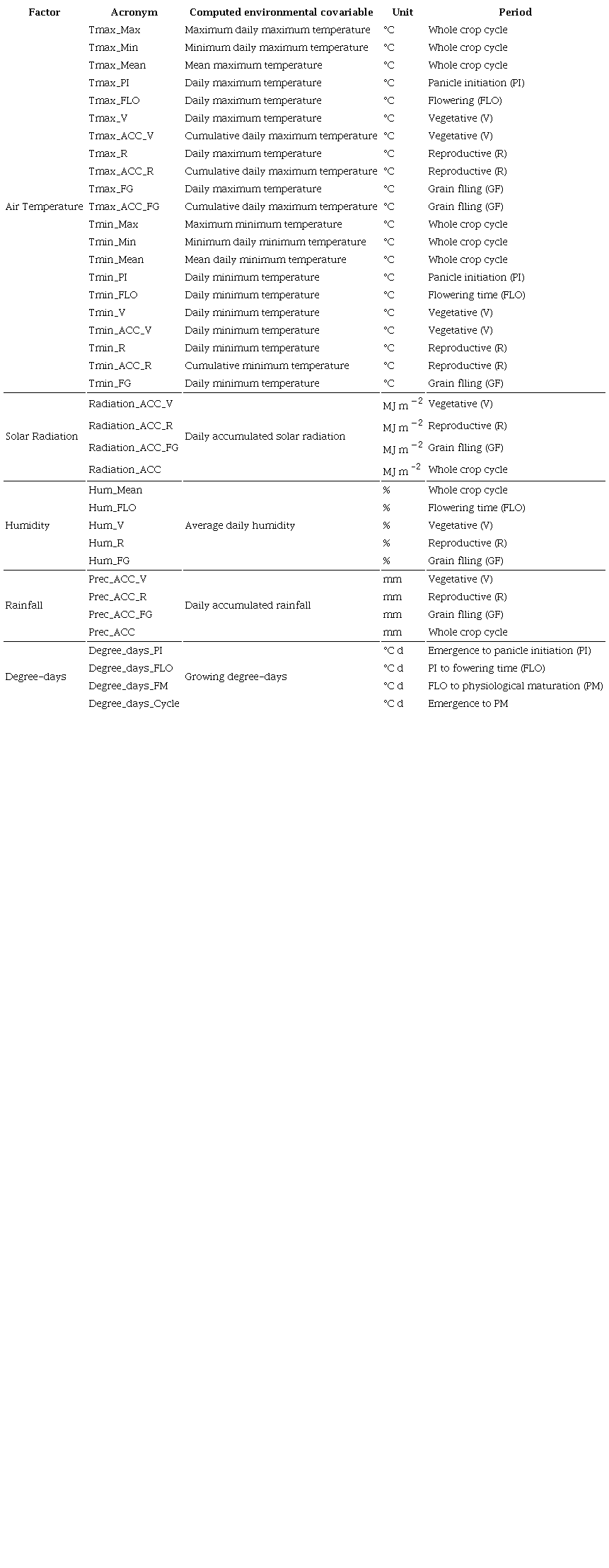 After aligning the trials with climate data, environmental covariates were selected, as summarized in Table 1, which effectively captured temporal variations across the crop life cycle. Development stages were calculated at the feld trial level using mean values of fowering day and physiological maturation observed in each trial. For the reproductive stage, panicle initiation (corresponding to stage R0) was assumed to begin at 25 days before the fowering day, as panicle initiation is not directly observed in feld trials. The calculation of efective daily heat units (degree-days) considered the daily mean temperature and three cardinal temperatures: base (8 °C), optimum (30 °C) and maximum (42 °C) thresholds, following the equation described by Heinemann et al. (2017). This approach allowed to screen environmental covariates for their impact on upland rice grain yield in the Brazilian central region.