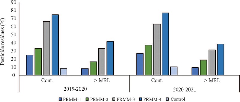 A comparison of the percentages of the samples contaminated and exceeding maximum residual limits revealed that no significant difference was recorded between the 2019-2020 and 2020-2021 seasons, while a significant difference was recorded among different PRMM, in comparison to each other and the control. Samples collected from all the PRMM in 2019-2020 were analyzed for pesticide residues and revealed that 25 % of the samples from PRMM-I were contaminated, among which 8.33 % were above the maximum residue limits, while 16.66 % of the samples from PRMM-II were contaminated, for a total of 33.33 %. Similarly, 66.66 % were contaminated for PRMM-III, among which 33.33 % were above the maximum residue limits, and PRMM-IV showed a maximum (75 %) contamination level with a 41.66 % violation rate, while the control module showed 8.33 % for sample contamination, with no sample exceeding the maximum residue limits (Figure 1).