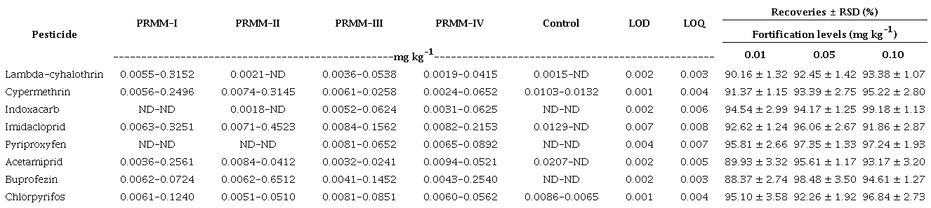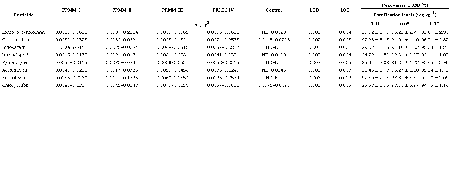 In 2019-2020, the pesticide residues were detected in the range of 0.0021-0.1350 mg kg-1 for PRMM-I, 0.0017-0.2514 mg kg-1 for PRMM-II, 0.0019-0.1524 mg kg-1 for PRMM-III and 0.0025-0.3651 mg kg-1 for PRMM-IV, in comparison to the control (0.0075-0.0203 mg kg-1) (Table 1). In 2019-2020, they ranged 0.0036-0.3251 mg kg-1 for PRMM-I, 0.0018-0.6512 mg kg-1 for PRMM-II, 0.0032-0.1562 mg kg-1 for PRMM-III and 0.0019-0.2540 mg kg-1 for PRMM-IV, while the control module expressed a relatively shorter concentration range (0.0015-0.0132 mg kg-1) (Table 2). These results are also in line with the findings of Kumari et al. (2002), who monitored 60 samples of market vegetables and reported that the tested samples showed 100 % of contamination with low, but measurable, amounts of residues.