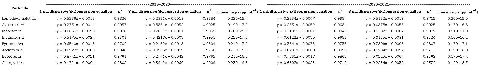 The linearity of the samples was calculated on the basis of two fortification levels to calculate the correlation coefficient (R2), and the regression equation was generated (Table 3). The limit of detection for all the pesticides was less than the minimum concentration that was quantified in the samples, while the standard deviation was calculated as less than 20 % (Tables 1 and 2). Similar results were reported by Sinha et al. (2012), where the limit of detection ranged 0.0006-0.091, while the relative standard deviation was less than 10 %, with less than 10 % for R2. Differences were attributed to the equipment used, which was an LC-MSMS in the latter case, while the method accuracy was above 99 % in both studies.