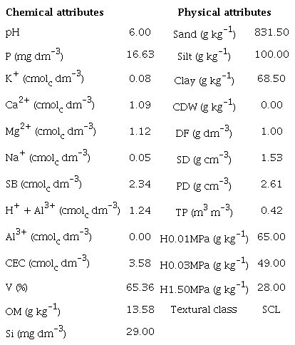 The cattle manure characteristics were: pH (H2O) = 7.7; electrical conductivity = 6.09 dS m-1; organic matter = 36.2 dag kg-1; organic carbon = 166.9 g kg-1; N = 13.9 g kg-1; C/N ratio = 12; P = 3.2 cmolc dm-3; K+ = 18.7 cmolc dm-3; Ca2+ = 16.2 cmolc dm-3; Mg2+ = 6.1 cmolc dm-3; S = 2.5 cmolc dm-3; CEC = 133.9 mmol dm-3; B = 14.8 mg kg-1; Fe = 11,129.9 mg kg-1; Cu = 19.3 mg kg-1; Mn = 491.4 mg kg-1; Zn = 65.3 mg kg-1; Si (Embrapa 2009) = 12.5 g kg-1; Na+ = 3.5 g kg-1.