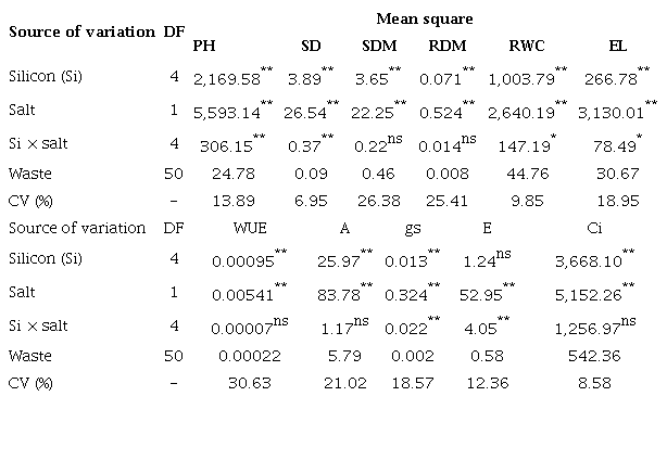Silicon is a promising alternative for reducing the impact of salinity on plant growth and yield (Liu et al. 2019, Singh et al. 2023), and its application during seedling formation can increase the plant tolerance to excess salts by reducing the absorption of sodium ions (Na+) due to root silicification, improving the plant’s structural properties (Cassel et al. 2021, Irfan et al. 2023). Furthermore, silicon helps to maintain water balance, stabilize cell membranes, antioxidant activity and essential element absorption, improving aspects related to plant physiology and growth (Liu et al. 2019, Mandlik et al. 2020, Singh et al. 2023).