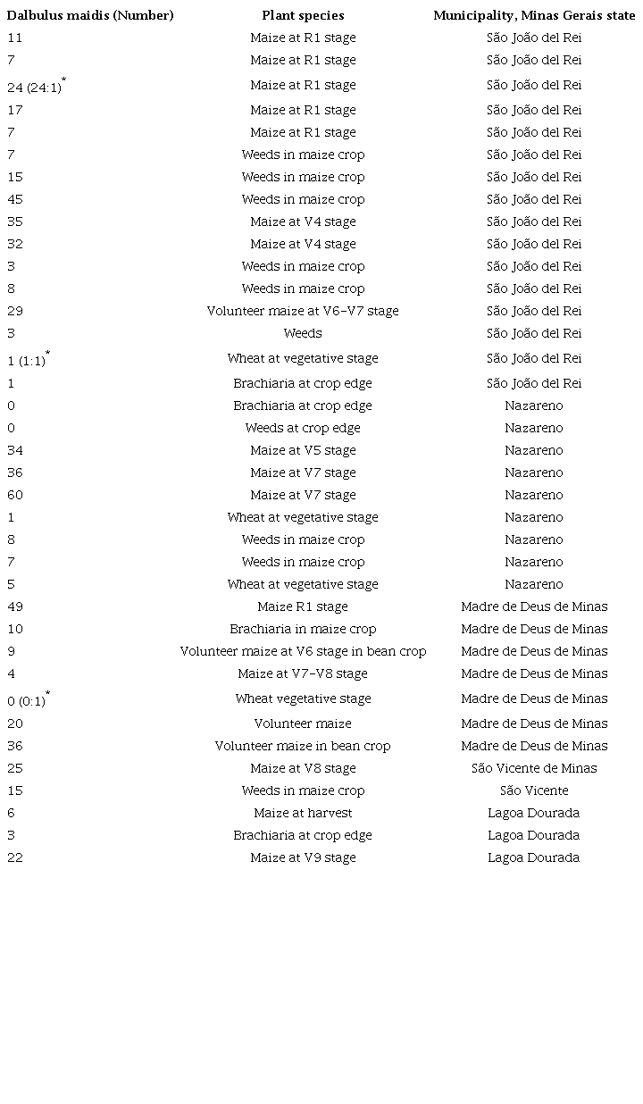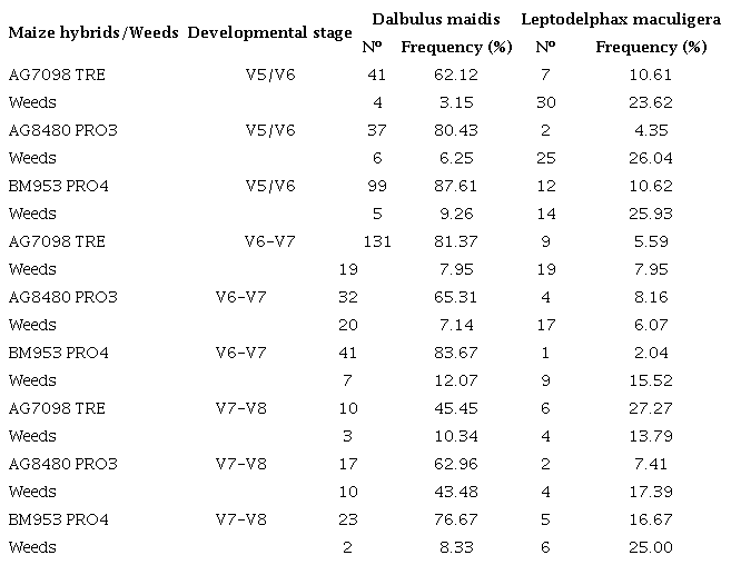 Co-occurrence and frequency of Leptodelphax maculigera and Dalbulus maidis in maize and weeds in the Minas Gerais state, Brazil1
