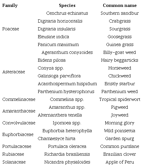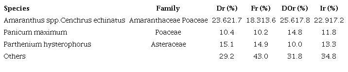 Twenty weed species belonging to nine botanical families were identified: Amaranthaceae, Asteraceae, Commelinaceae, Convolvulaceae, Euphorbiaceae, Poaceae, Portulacaceae, Rubiaceae and Solanaceae (Table 3). The Poaceae and Asteraceae families presented the greatest diversity of species. In addition to quantifying the species and the total number of individuals per sampled area, the following phytosociological parameters were calculated: relative frequency, relative density, relative dominance and relative importance index, as proposed by Silva et al. (2005) and Concenço et al. (2013) (Table 4). The phytosociological analysis showed that Amaranthus spp., Cenchrus echinatus, Panicum maximum and Parthenium hysterophorus were the species with the highest relative importance index in the maize crops.