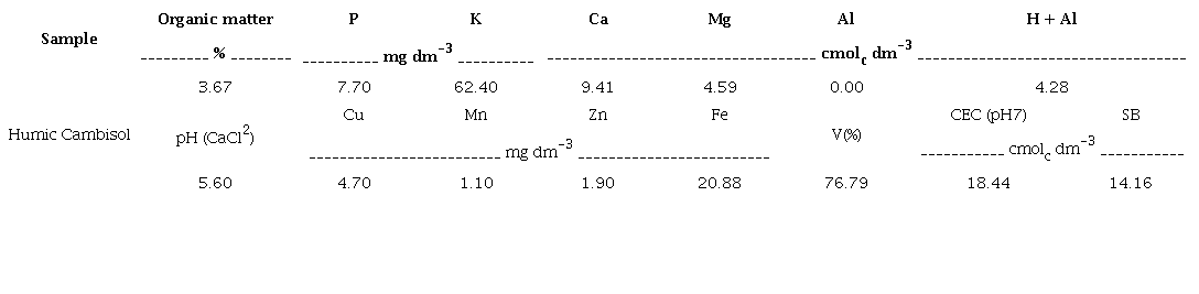 For the experiment, pots received 9 kg of soil with no agrochemical or mineral fertilizers applications, collected from the 0.00-0.20 m depth layer. The soil was classified as Humic Cambisol (Santos et al. 2018), equivalent to Inceptisols (USDA 2014), which was air-dried and then sieved (4-mm mesh). A sample was taken for chemical analysis (Table 1).